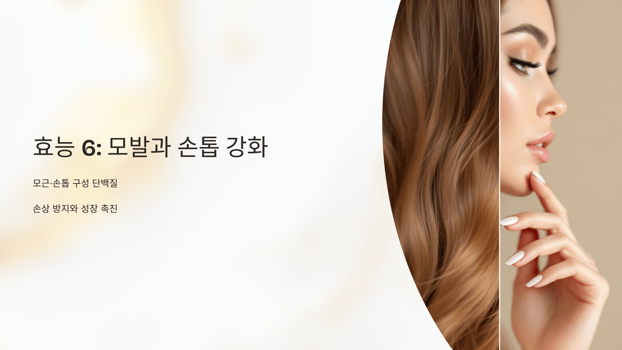 콜라겐은 모근·손톱을 구성하는 단백질로, 손상 방지와 성장을 도와줍니다.