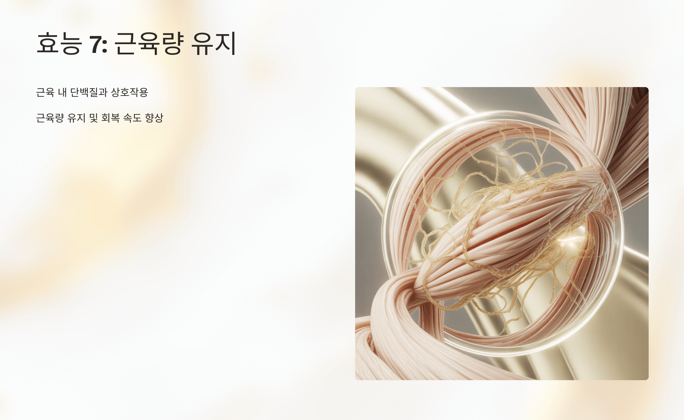 특정 형태의 콜라겐은 근육 내 단백질과 상호작용하여 근육량 유지 및 회복 속도 향상에 도움을 줄 수 있어요.