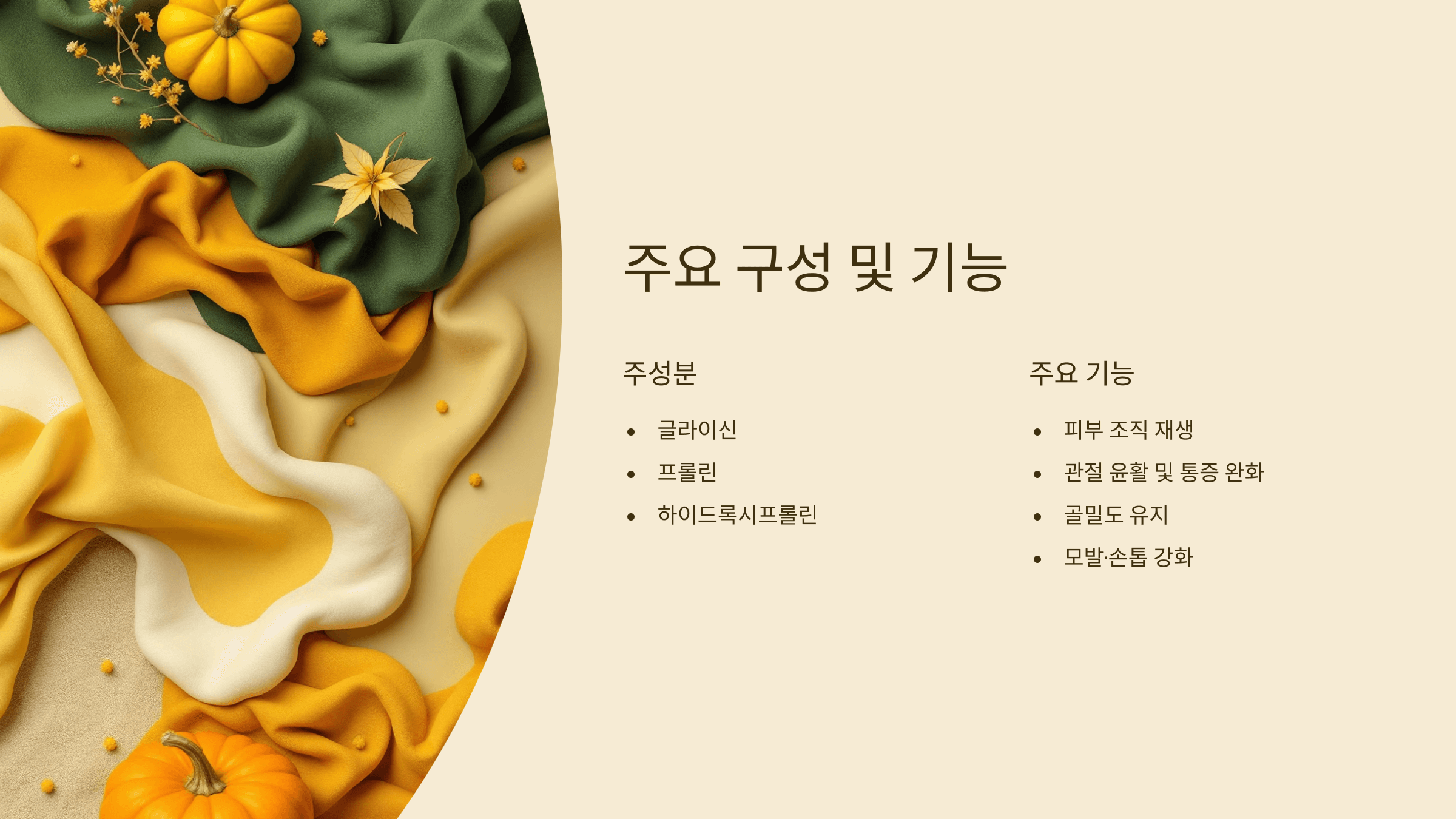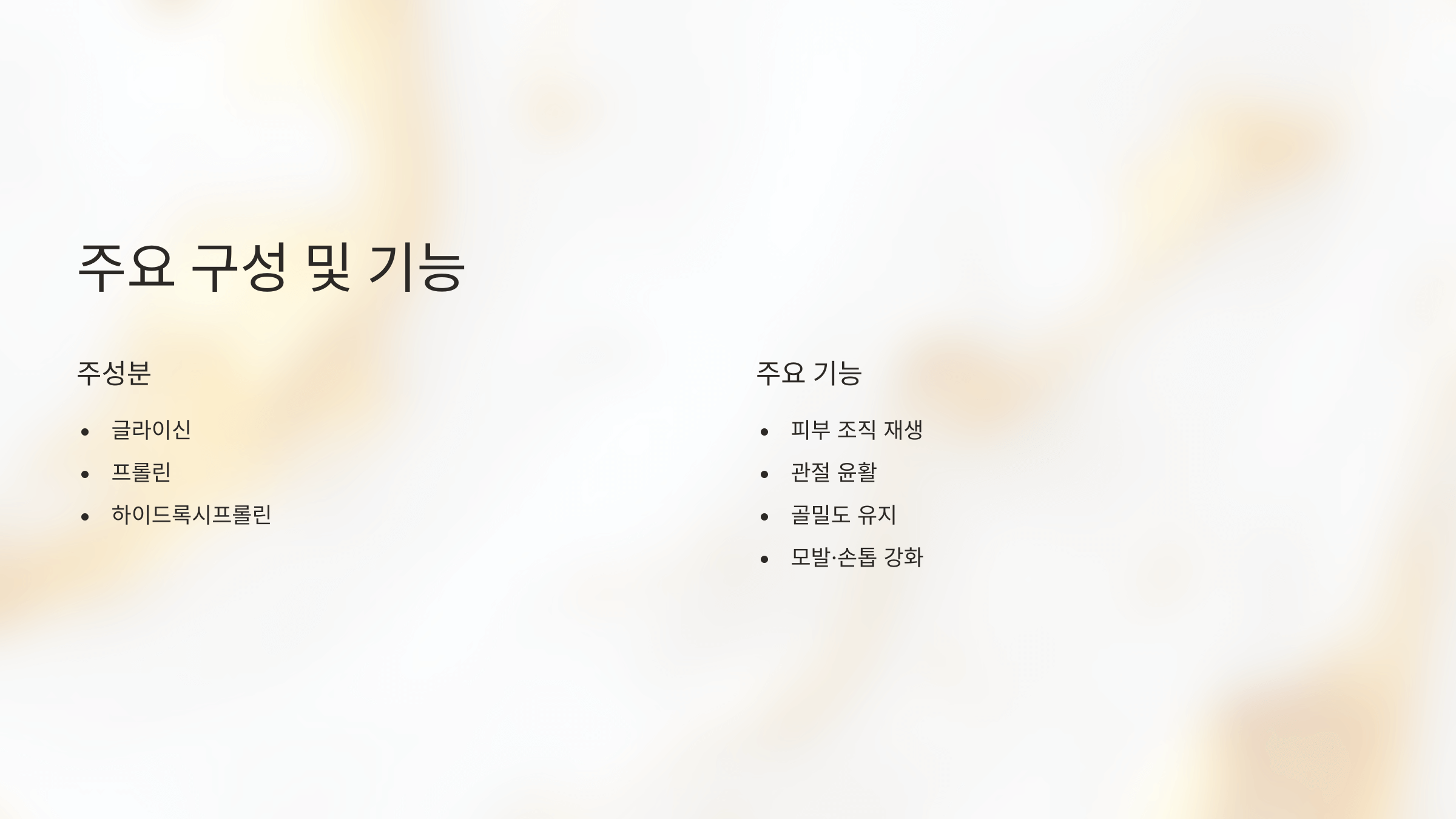 - 주성분: 글라이신(Glycine), 프롤린(Proline), 하이드록시프롤린