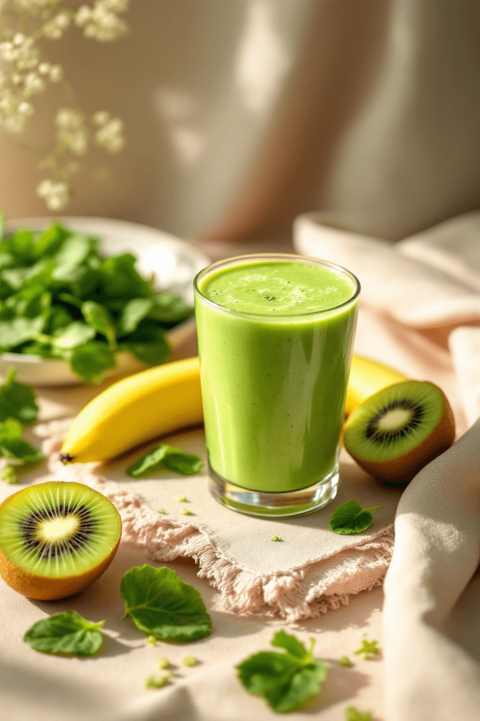 - 바나나, 키위, 시금치를 함께 갈아 만든 스무디는 아침 활력충전에 제격입니다.