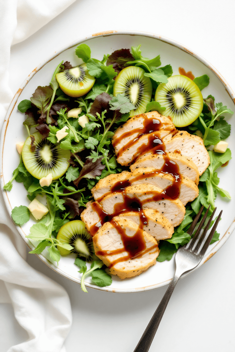 - 닭가슴살, 채소, 키위를 함께 넣고 발사믹 소스로 드레싱!