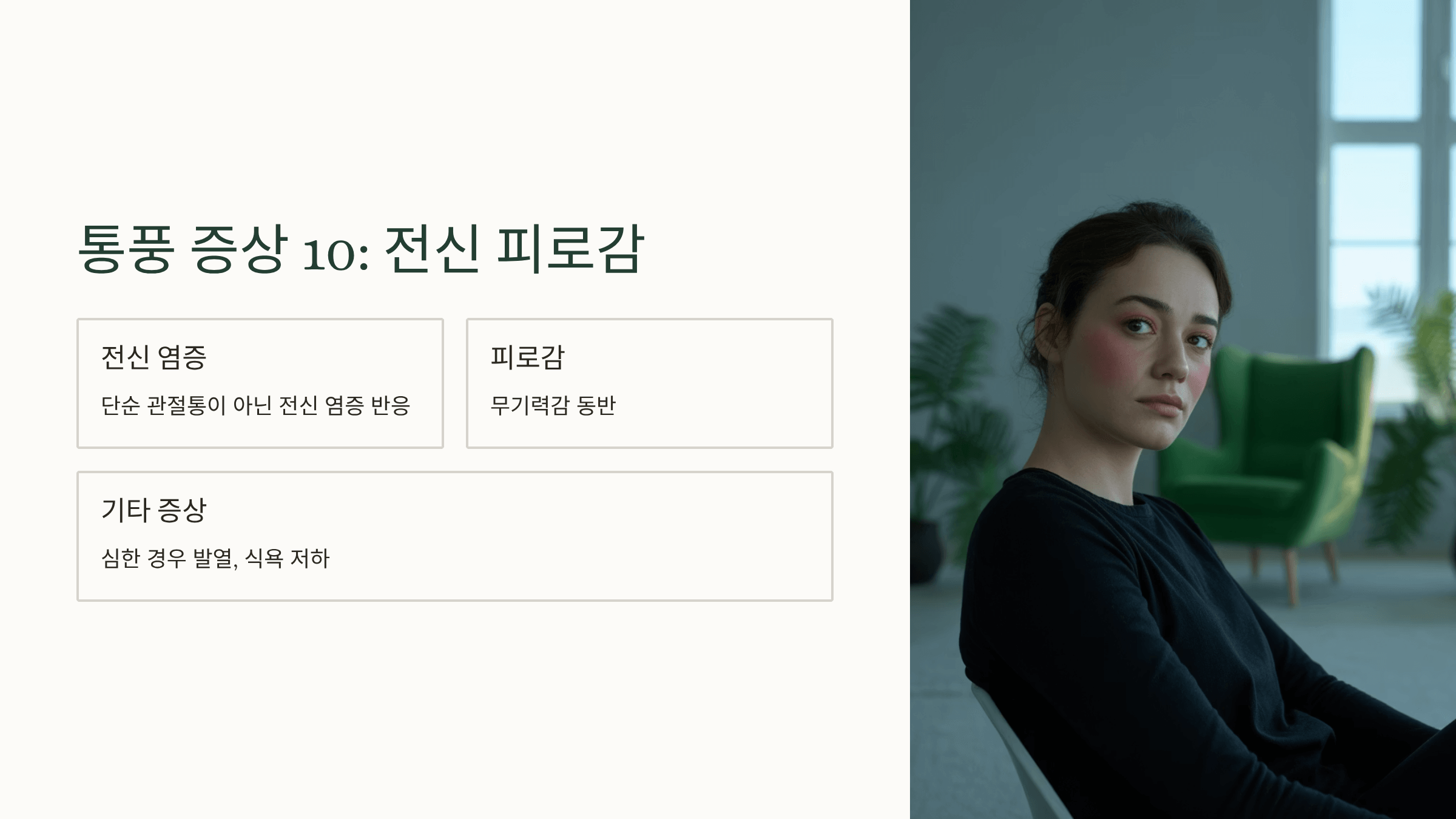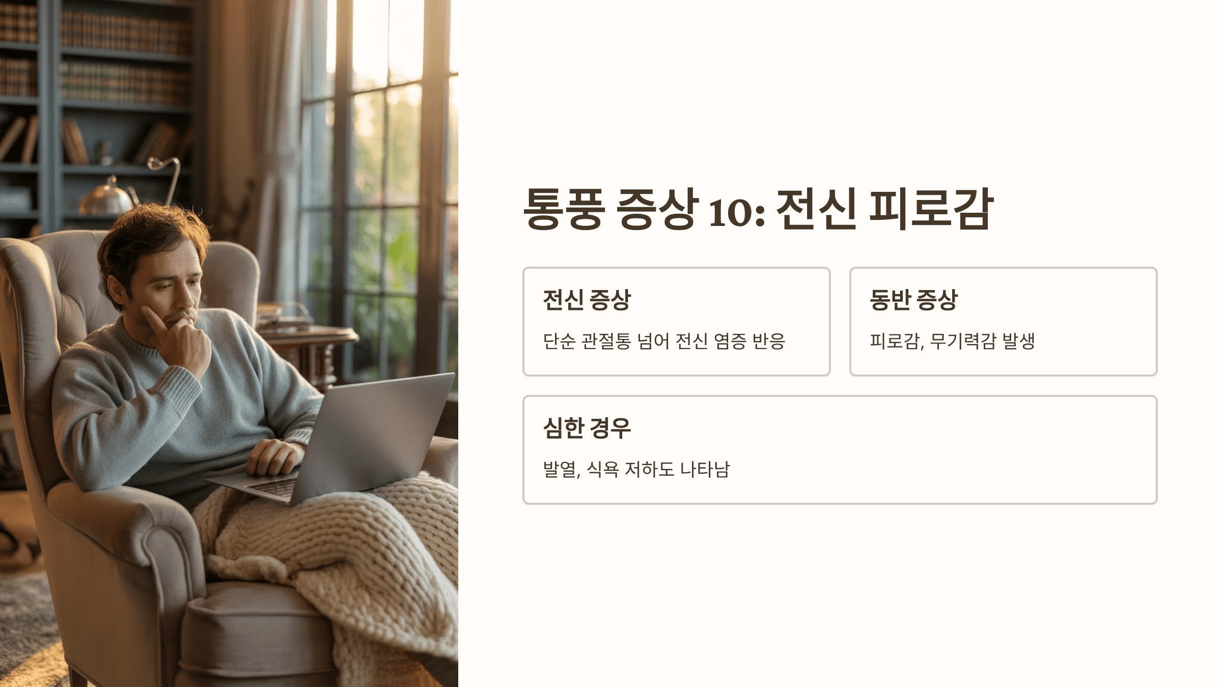 통풍은 단순히 관절만 아픈 것이 아니라, 전신 염증 반응으로 피로감, 무기력감을 동반하기도 합니다.