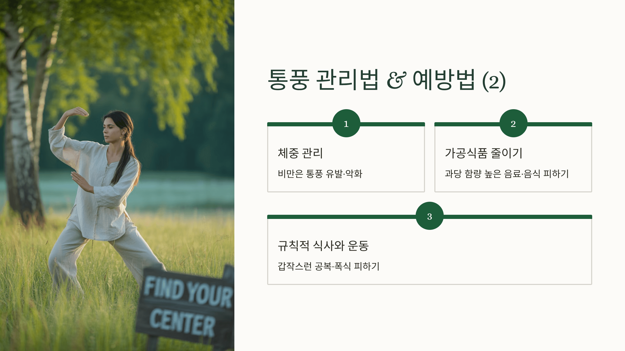 - 체중 관리: 비만은 통풍을 유발하고 악화시켜요.