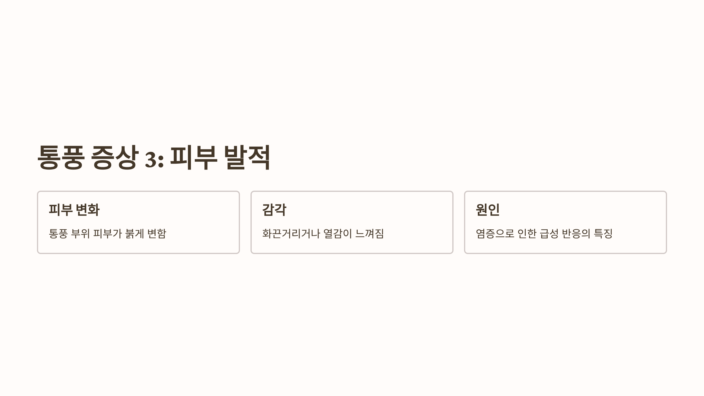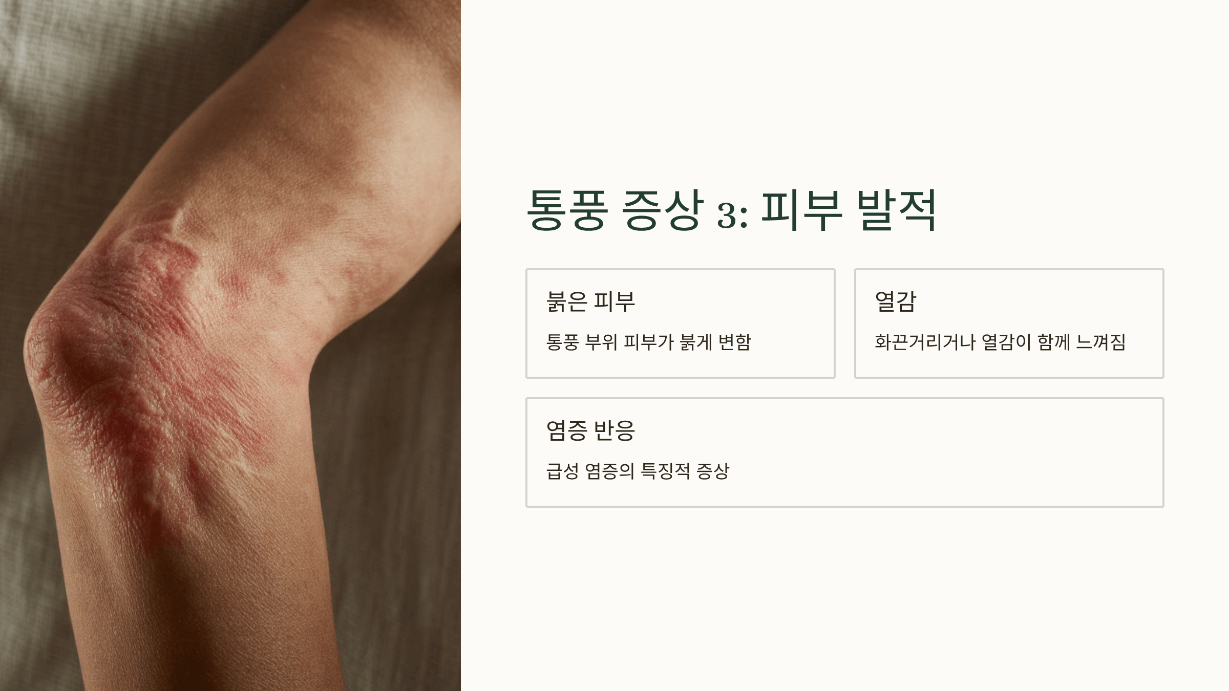 통풍 부위의 피부가 붉게 변하고 화끈거리거나 열감이 함께 느껴지는 경우가 많아요.