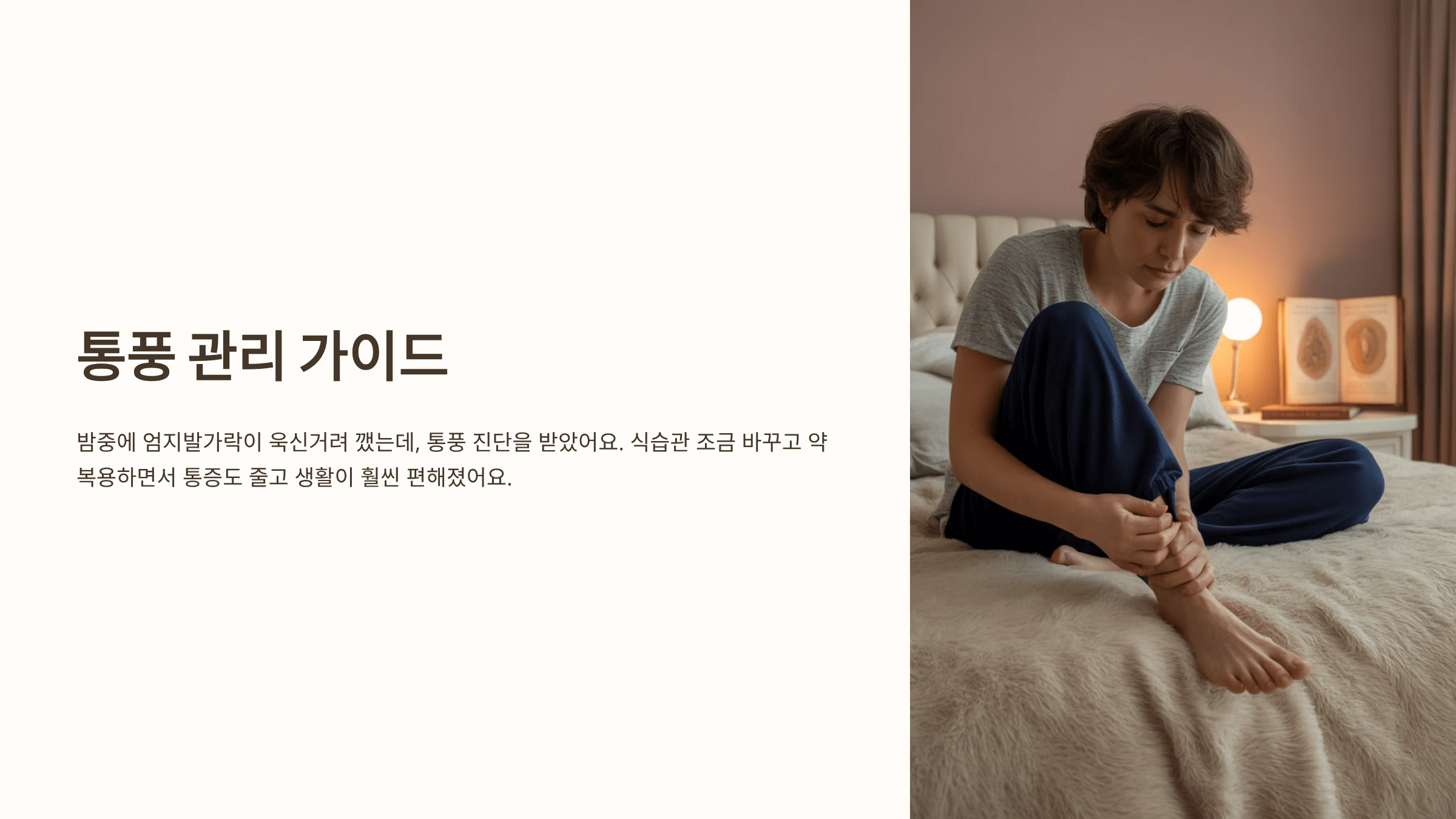 통풍은 단순한 관절 통증이 아닌 생활 전반을 관리해야 하는 만성질환이에요.