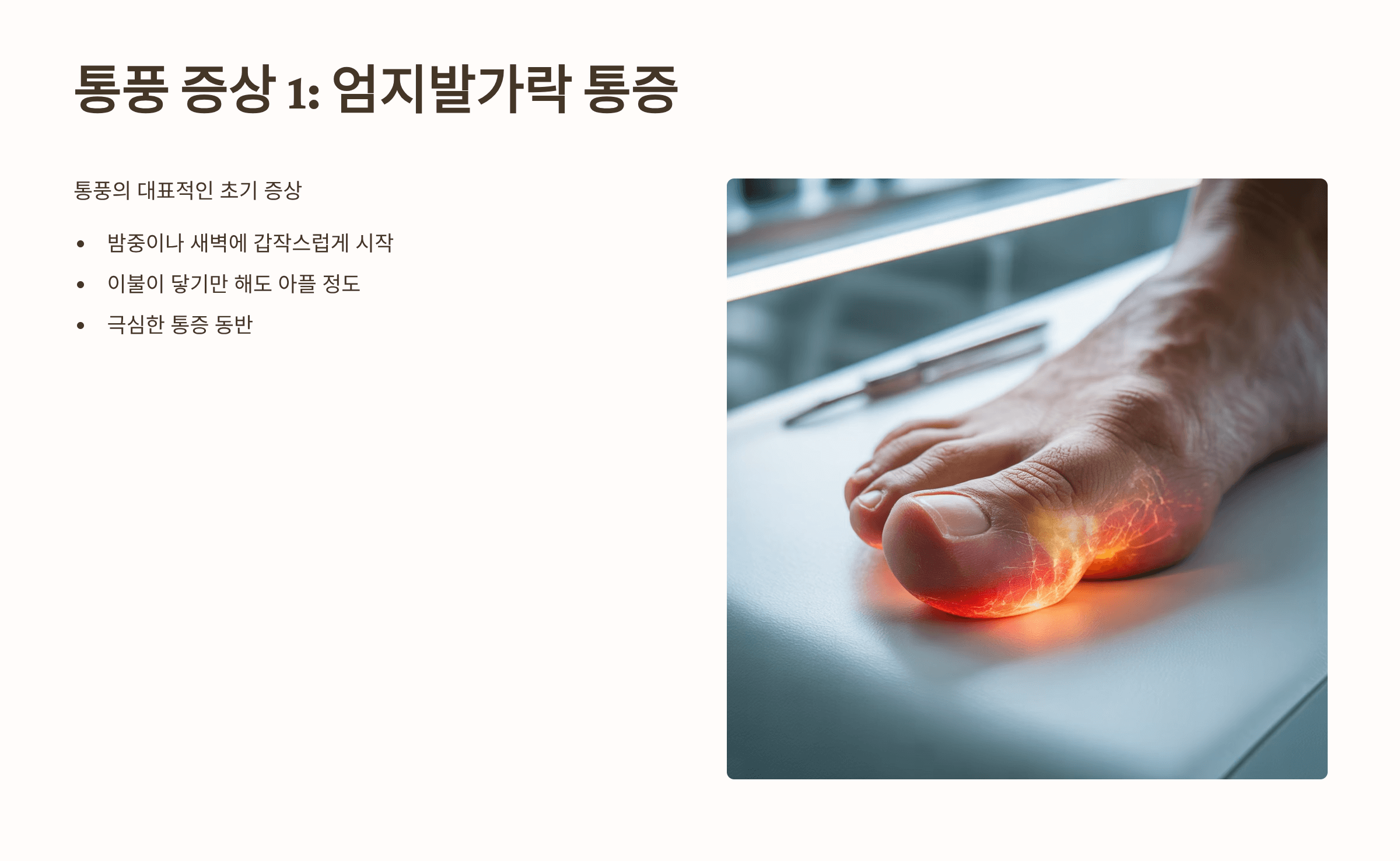 통풍의 대표적인 초기 증상은 바로 엄지발가락의 극심한 통증입니다.
