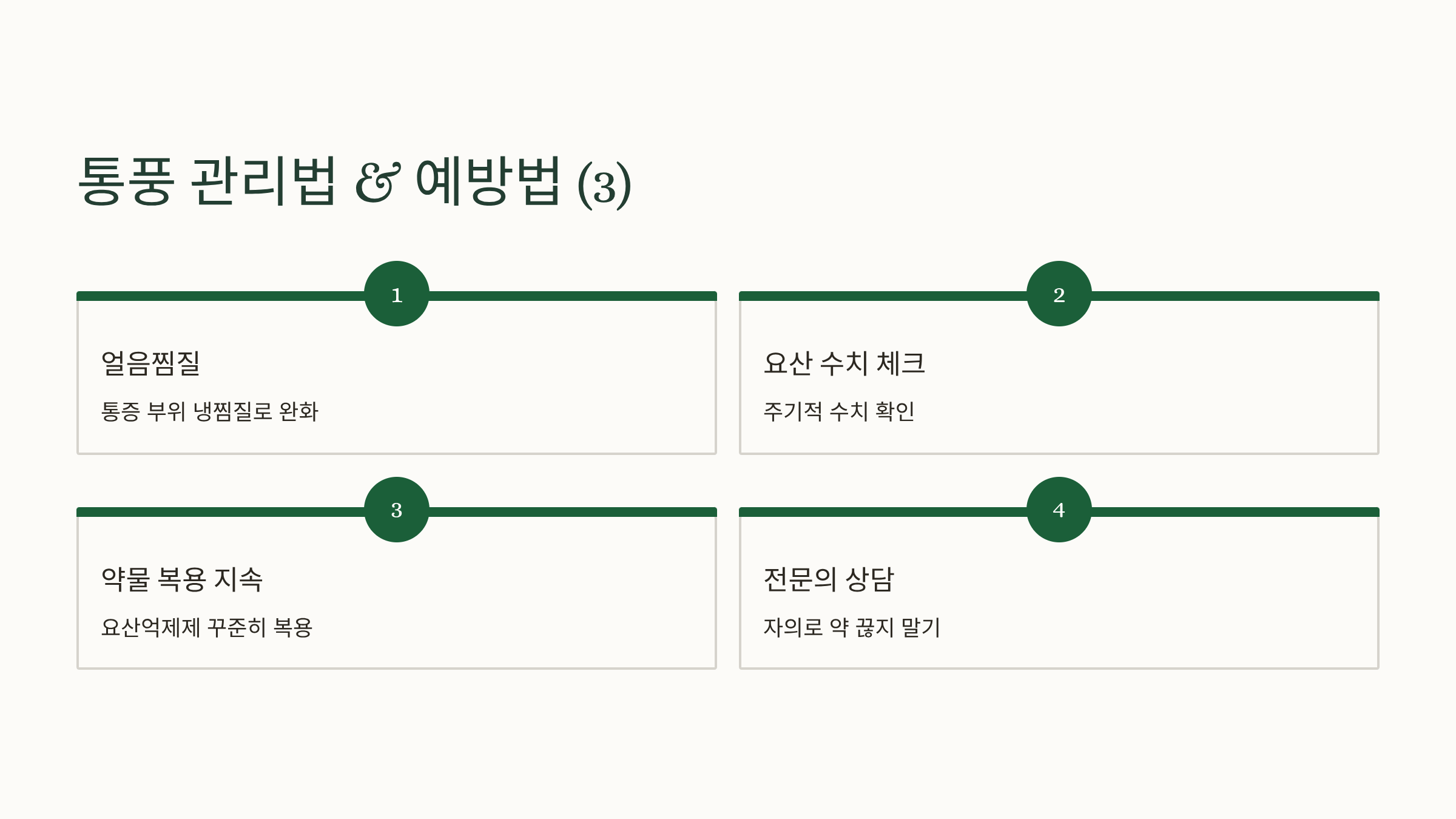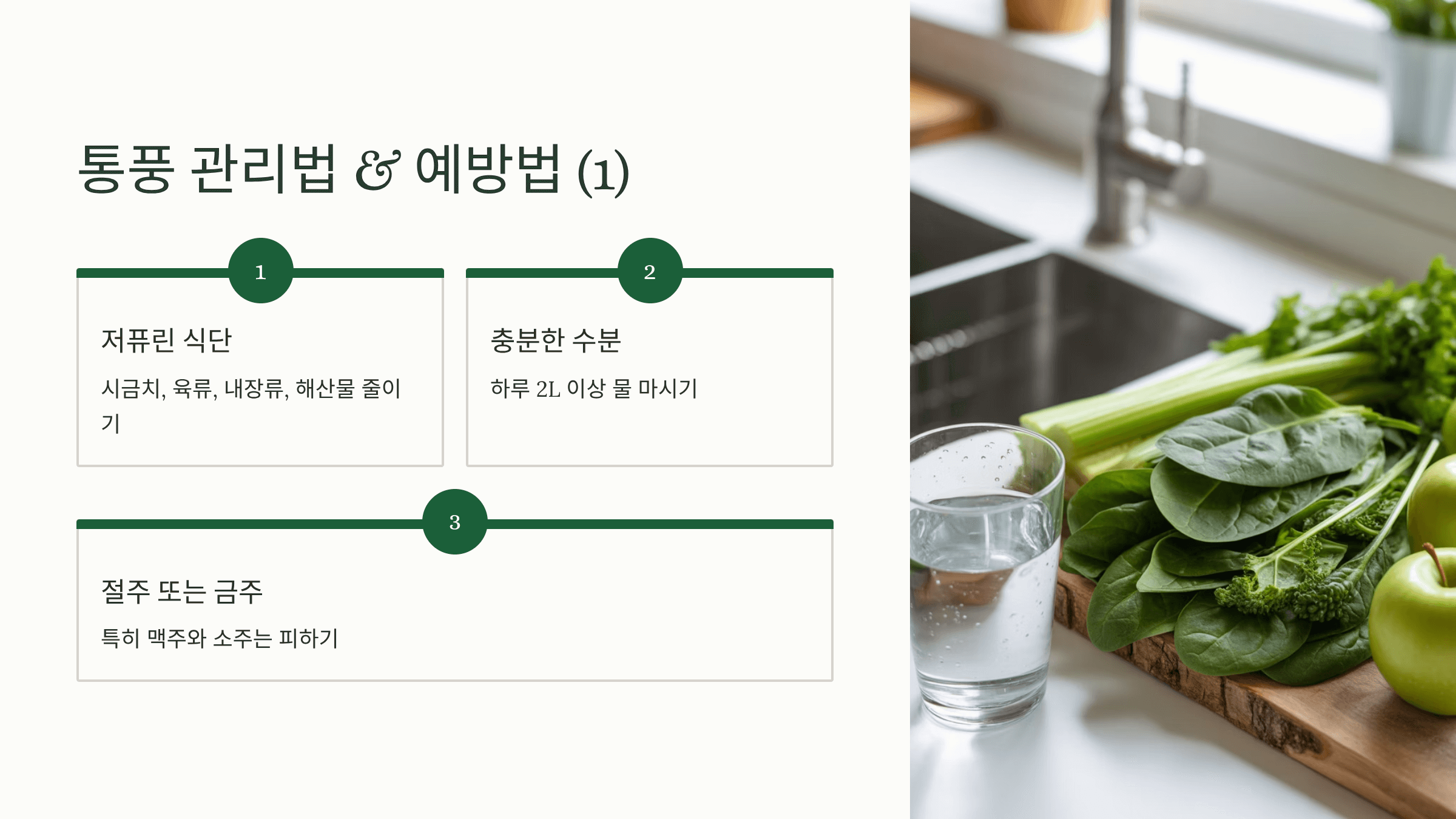 👉 충분한 수분 섭취, 금주, 체중 조절, 저퓨린 식단이 가장 효과적입니다.