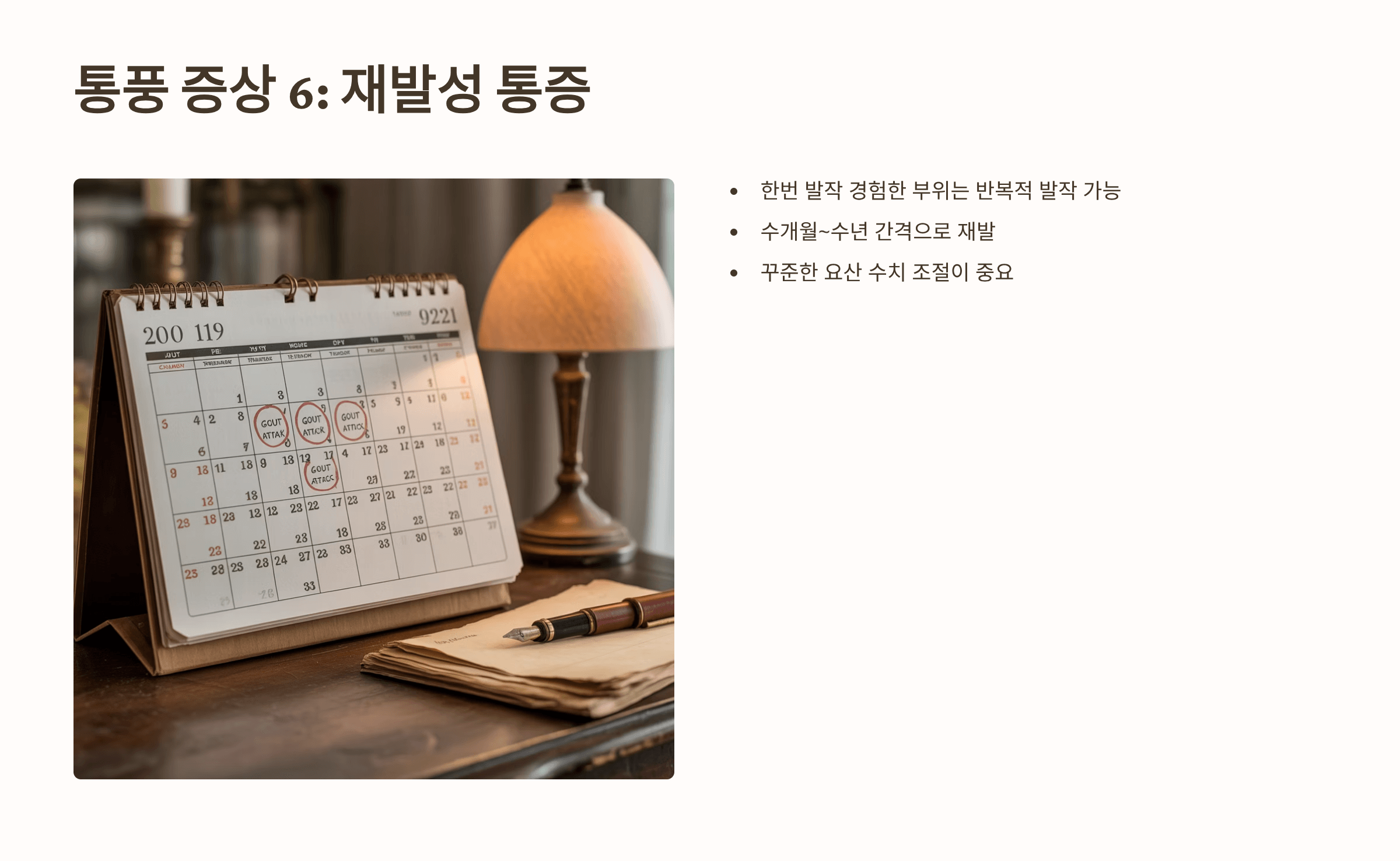 한 번 통풍 발작을 경험한 부위는 수개월~수년 간격으로 반복적인 발작이 생길 수 있어요.