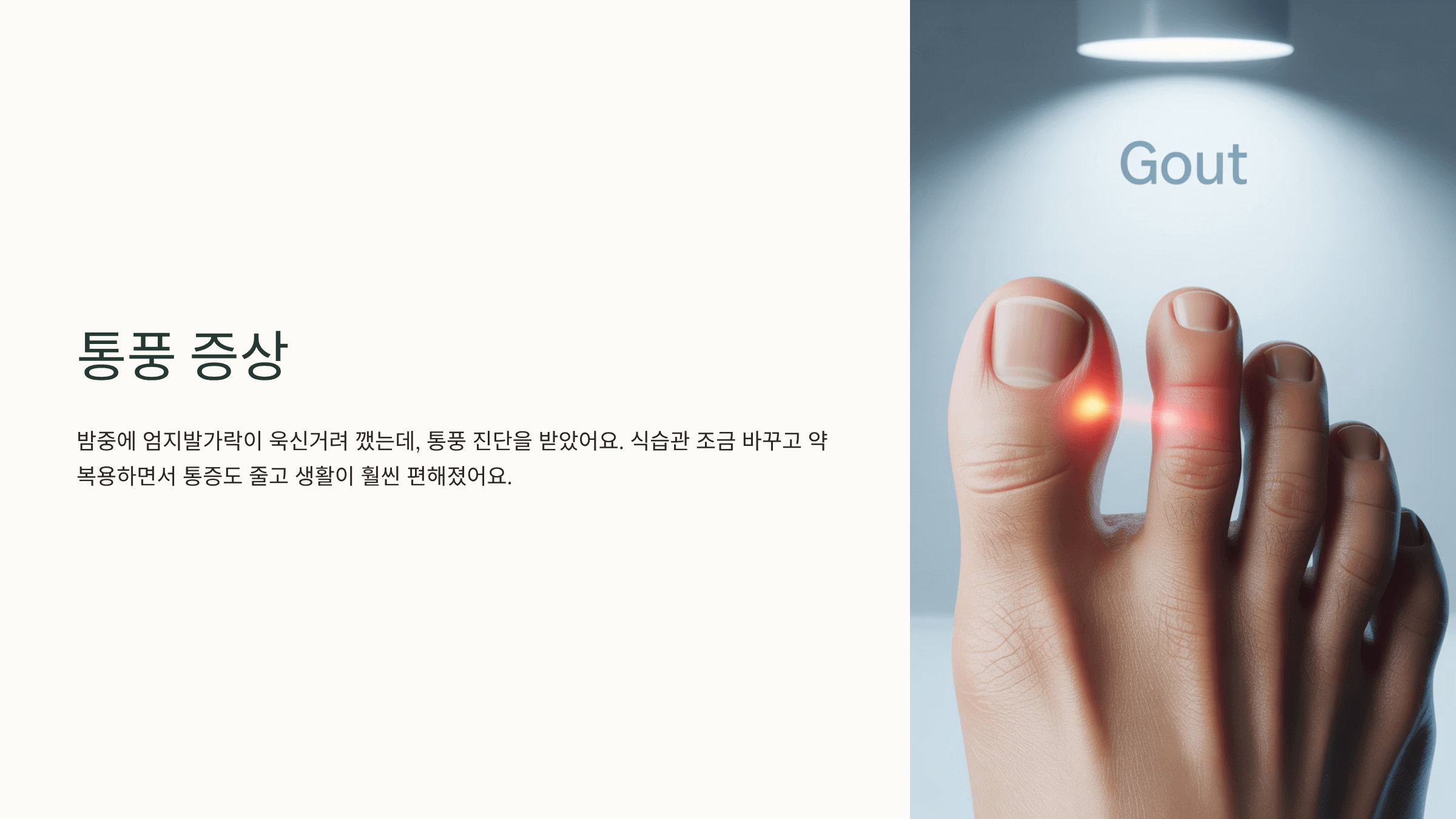 “밤중에 엄지발가락이 욱신거려 깼는데, 병원에서 통풍이라는 진단을 받았어요.”