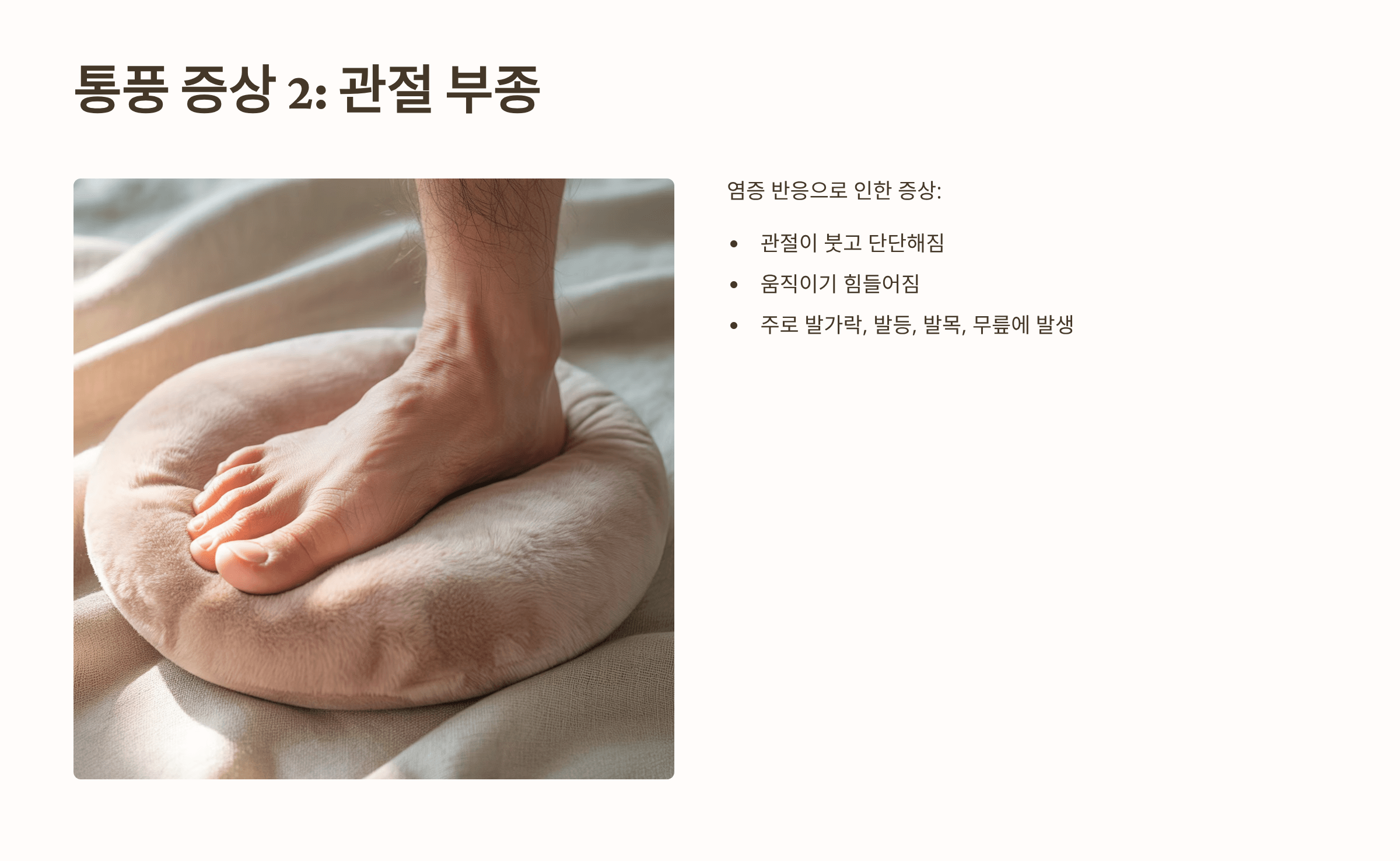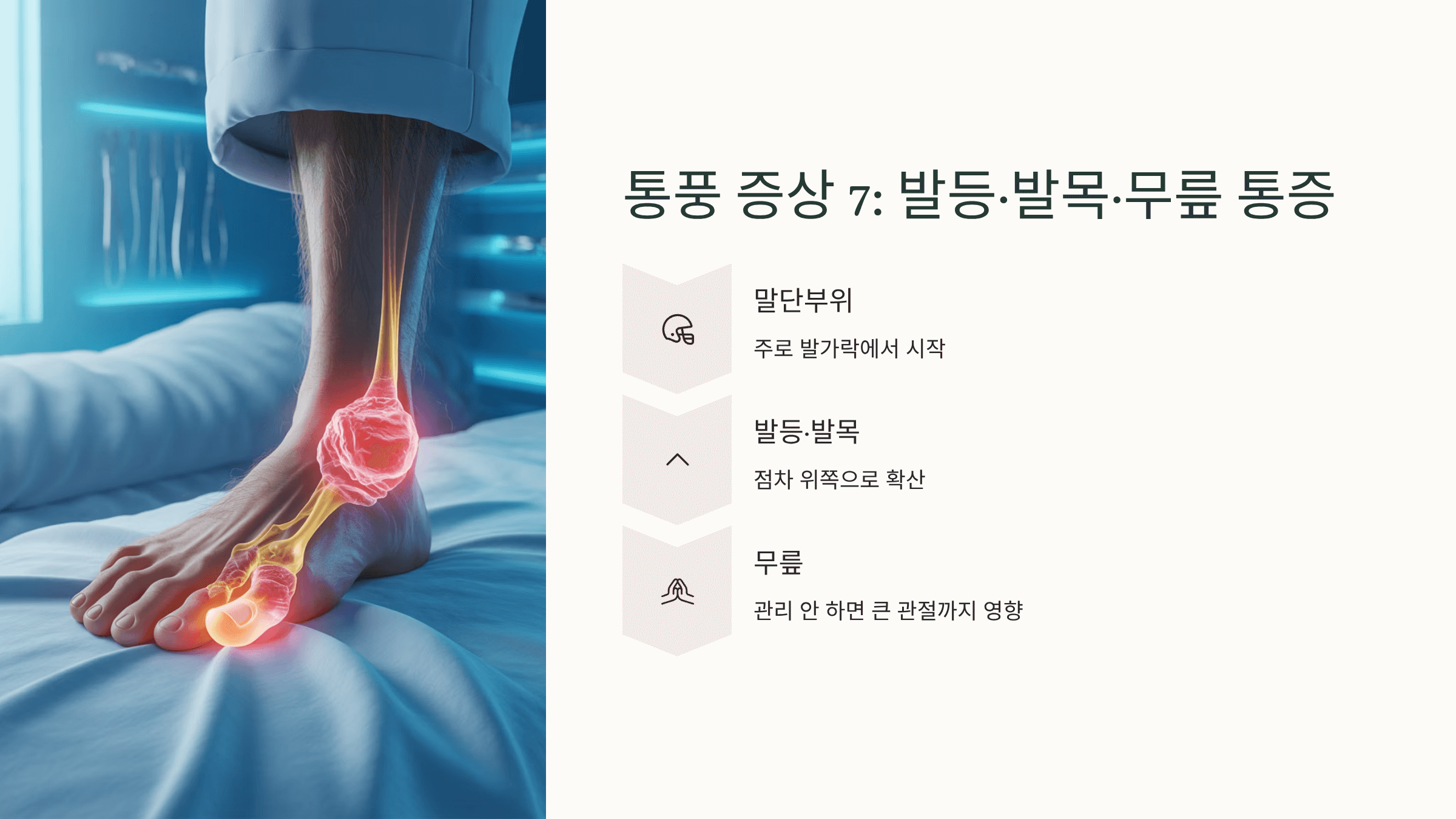 대개 발가락, 발등, 발목, 무릎처럼 말초 관절에 처음 나타나며, 남성 중년층에게 흔하지만 요즘은 식습관 변화로 젊은 층에도 늘고 있어요.
