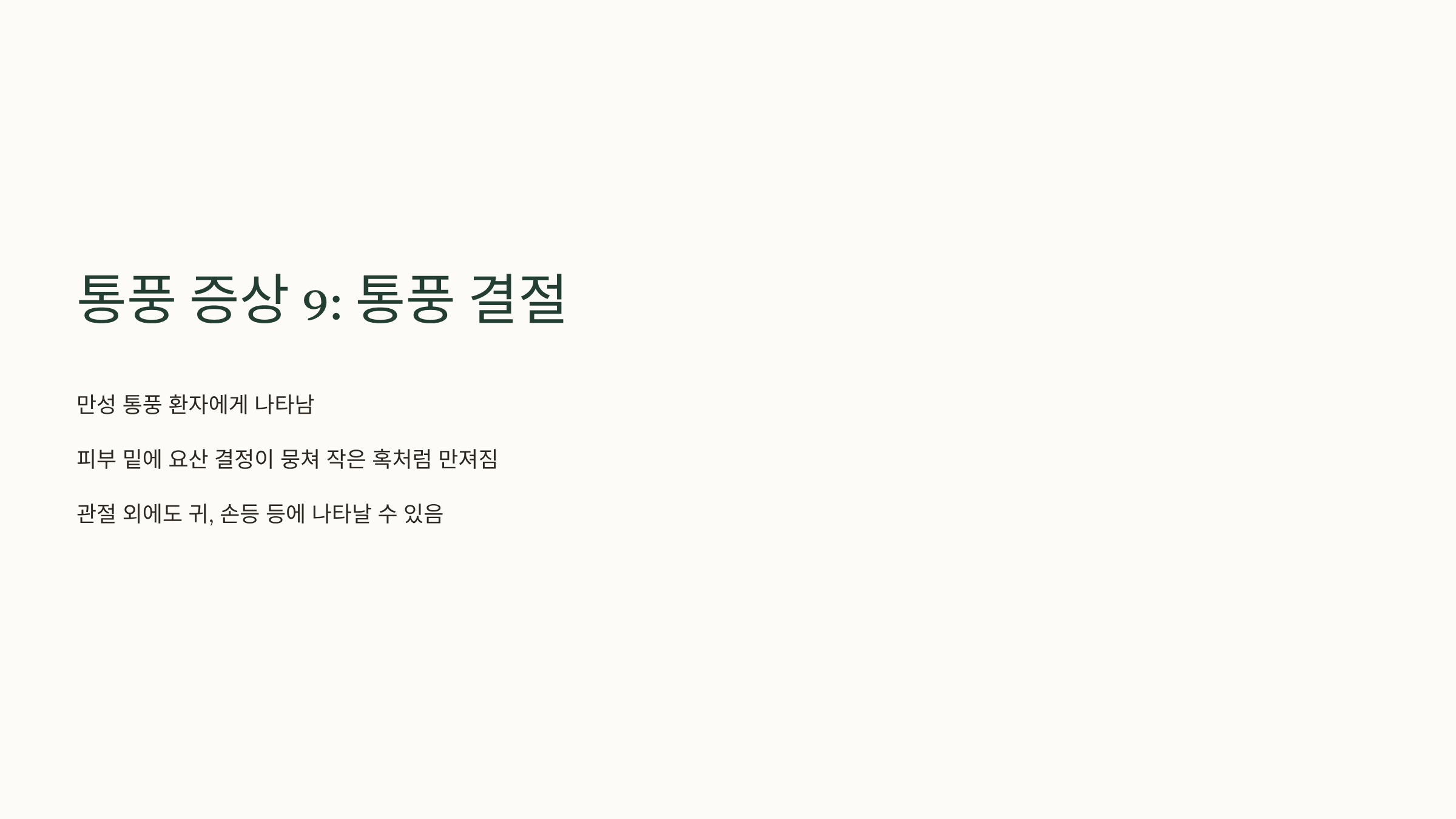 만성 통풍 환자에게는 피부 밑에 요산 결정이 뭉쳐서 작은 혹처럼 만져지는 결절이 생기기도 합니다.