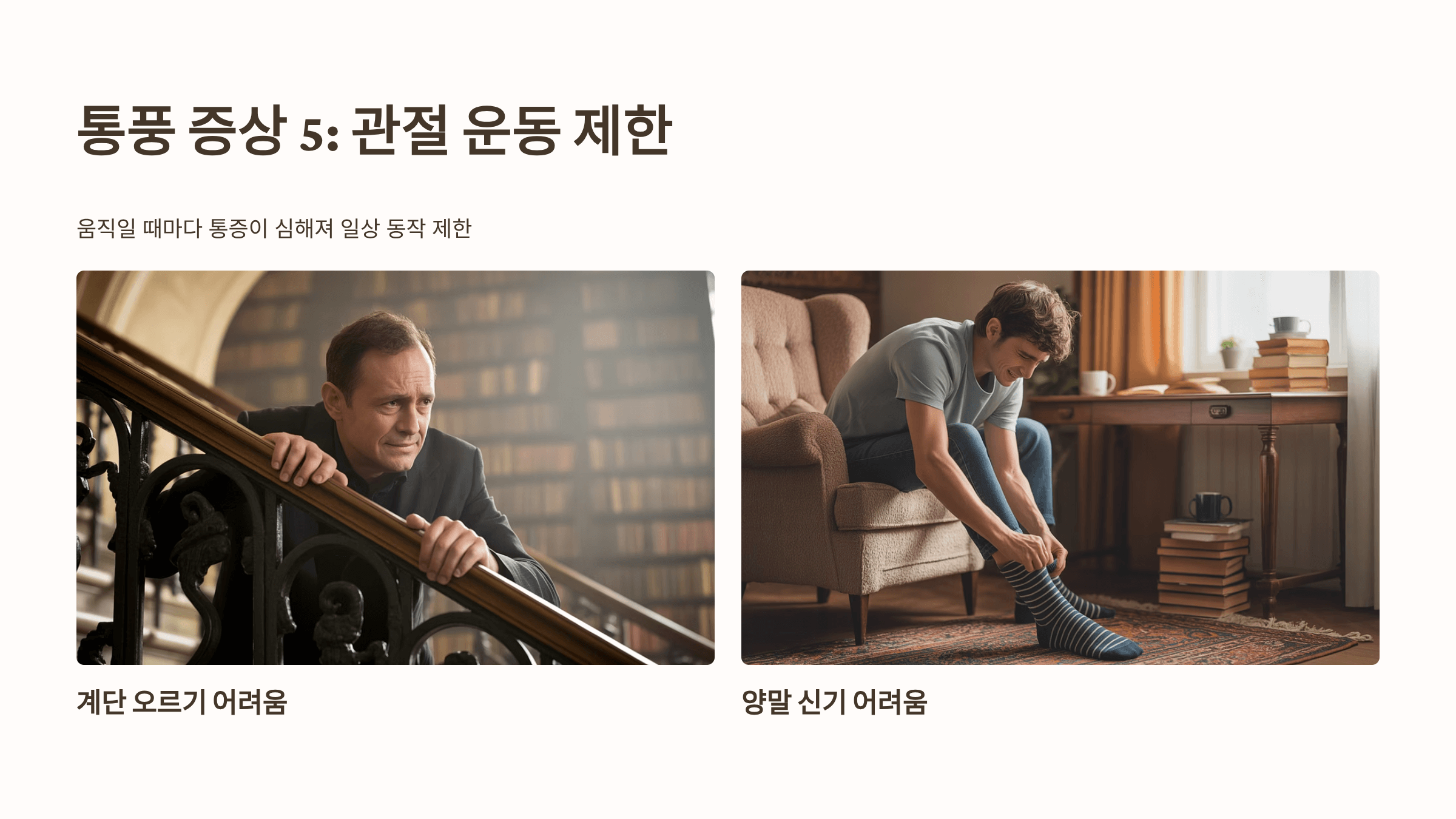 통풍이 생긴 부위는 움직일 때마다 통증이 심해져서 일상적인 동작이 제한됩니다.