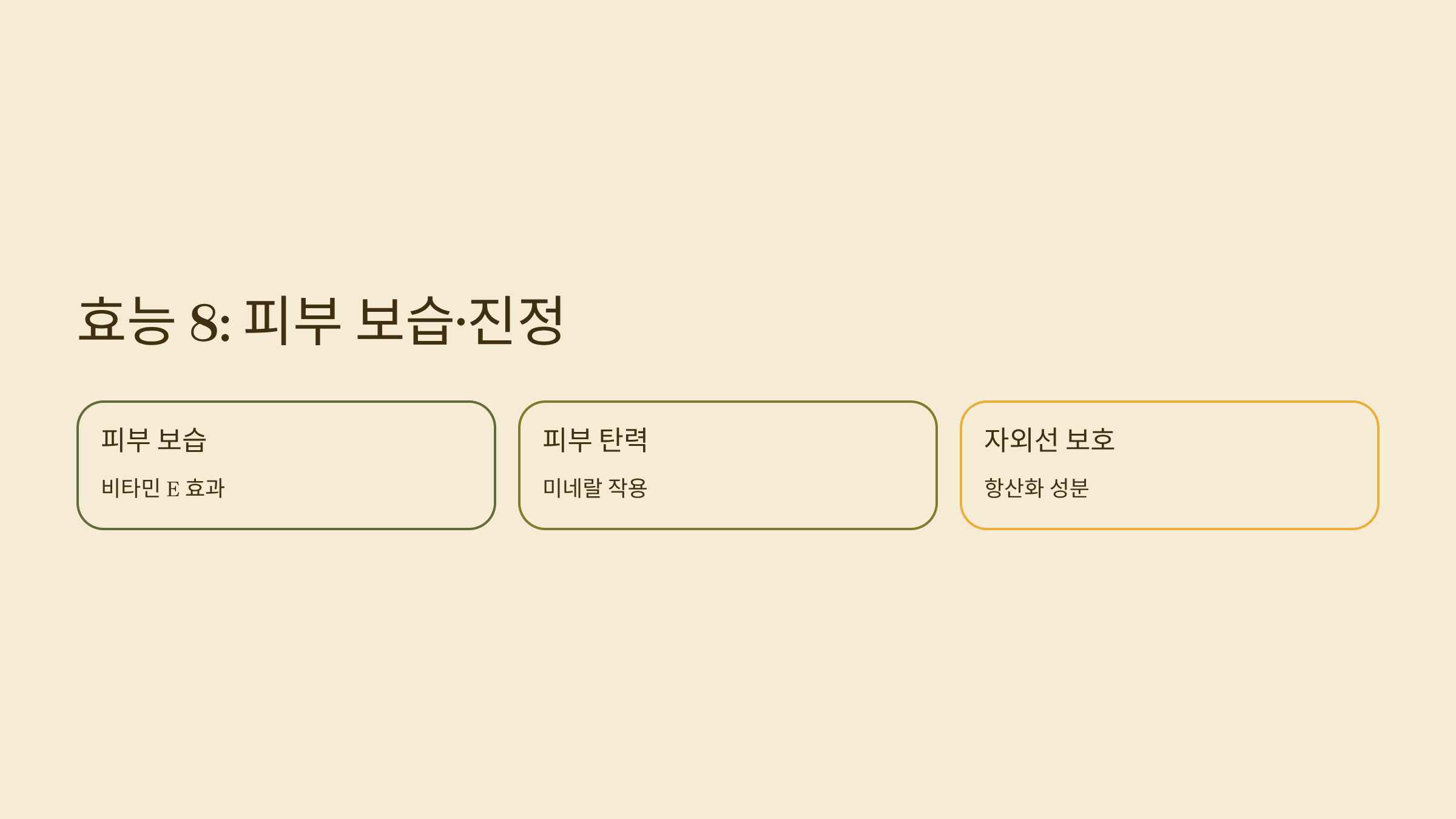 비타민 E와 미네랄 덕분에 피부 보습, 탄력, 자외선 보호에 도움됩니다.