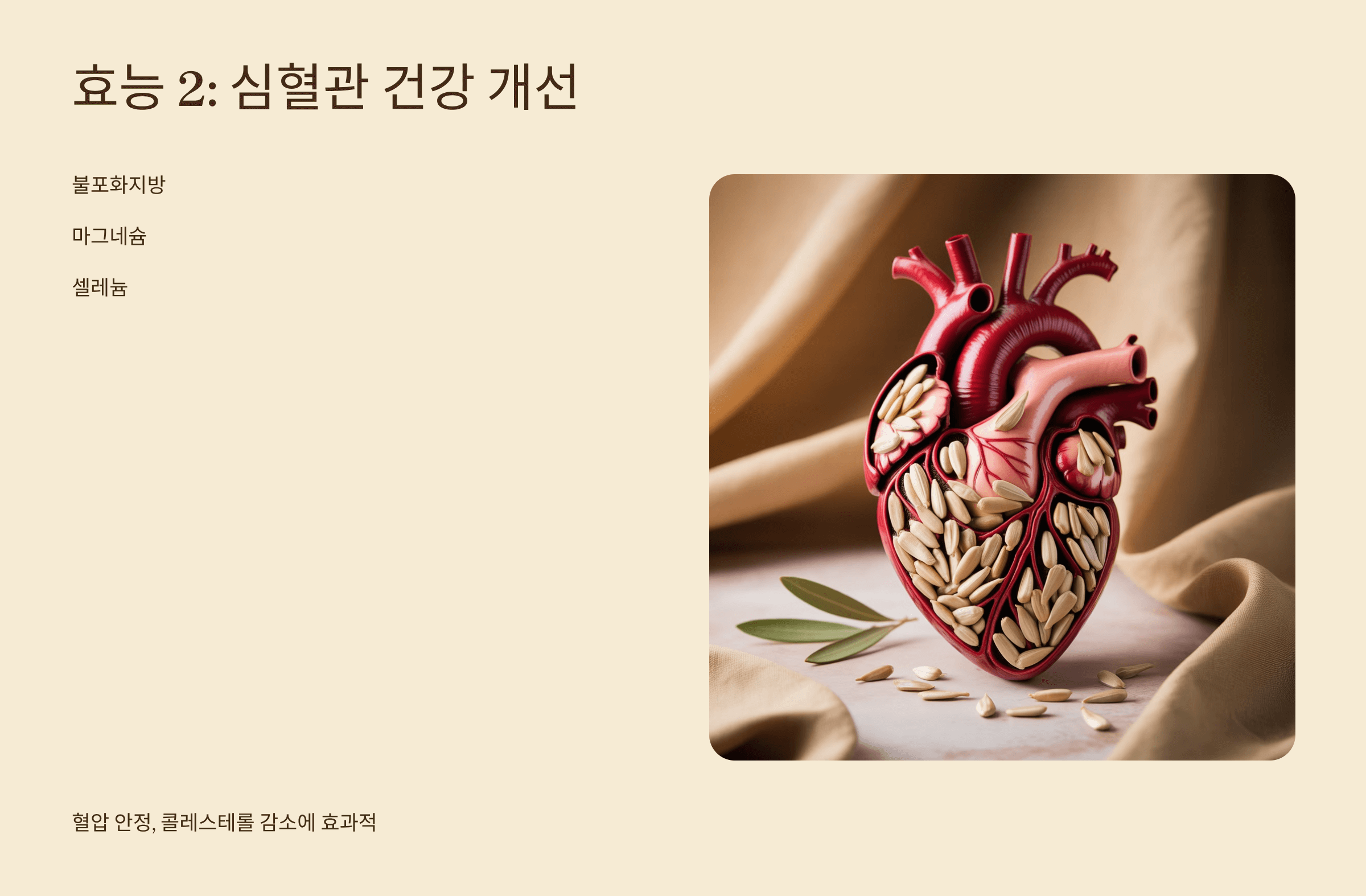 불포화지방과 마그네슘, 셀레늄이 혈압 안정, 콜레스테롤 감소에 효과적입니다.
