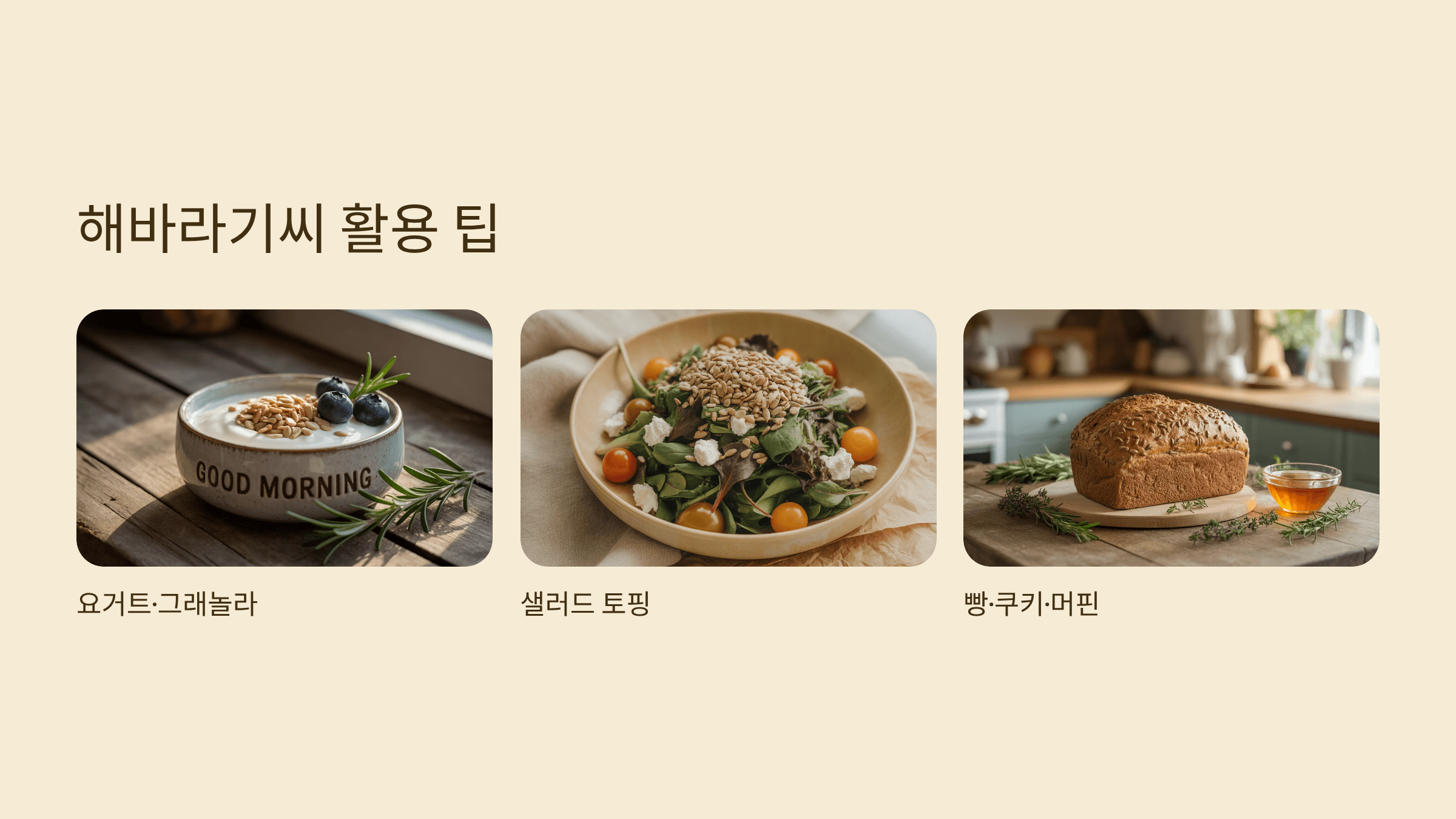 - 칼로리 과다 주의: 해바라기씨는 지방이 많으니 하루 1–2큰술 정도 적당해요.