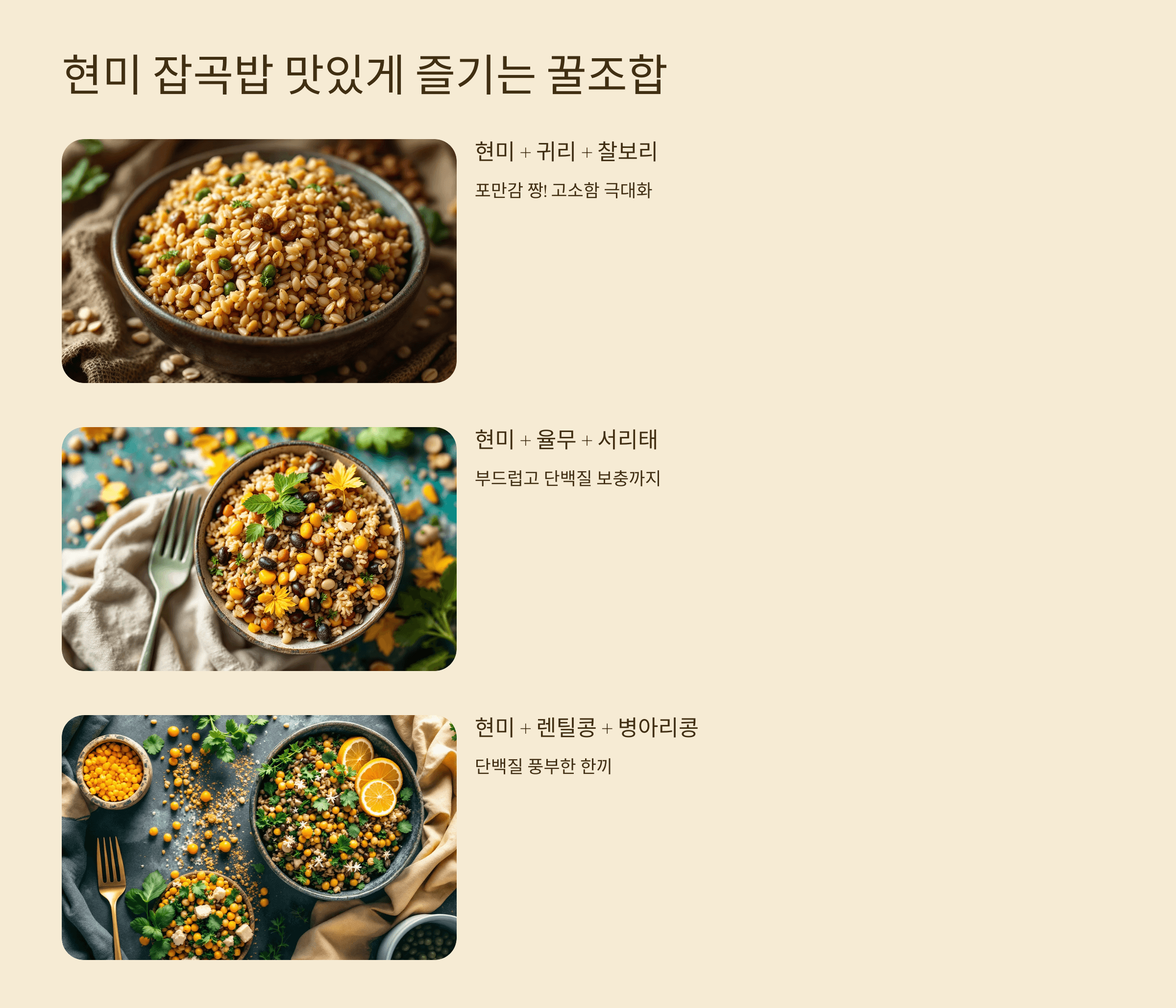 - 현미 + 렌틸콩 + 병아리콩: 외식 안 부러운 단백질 한끼