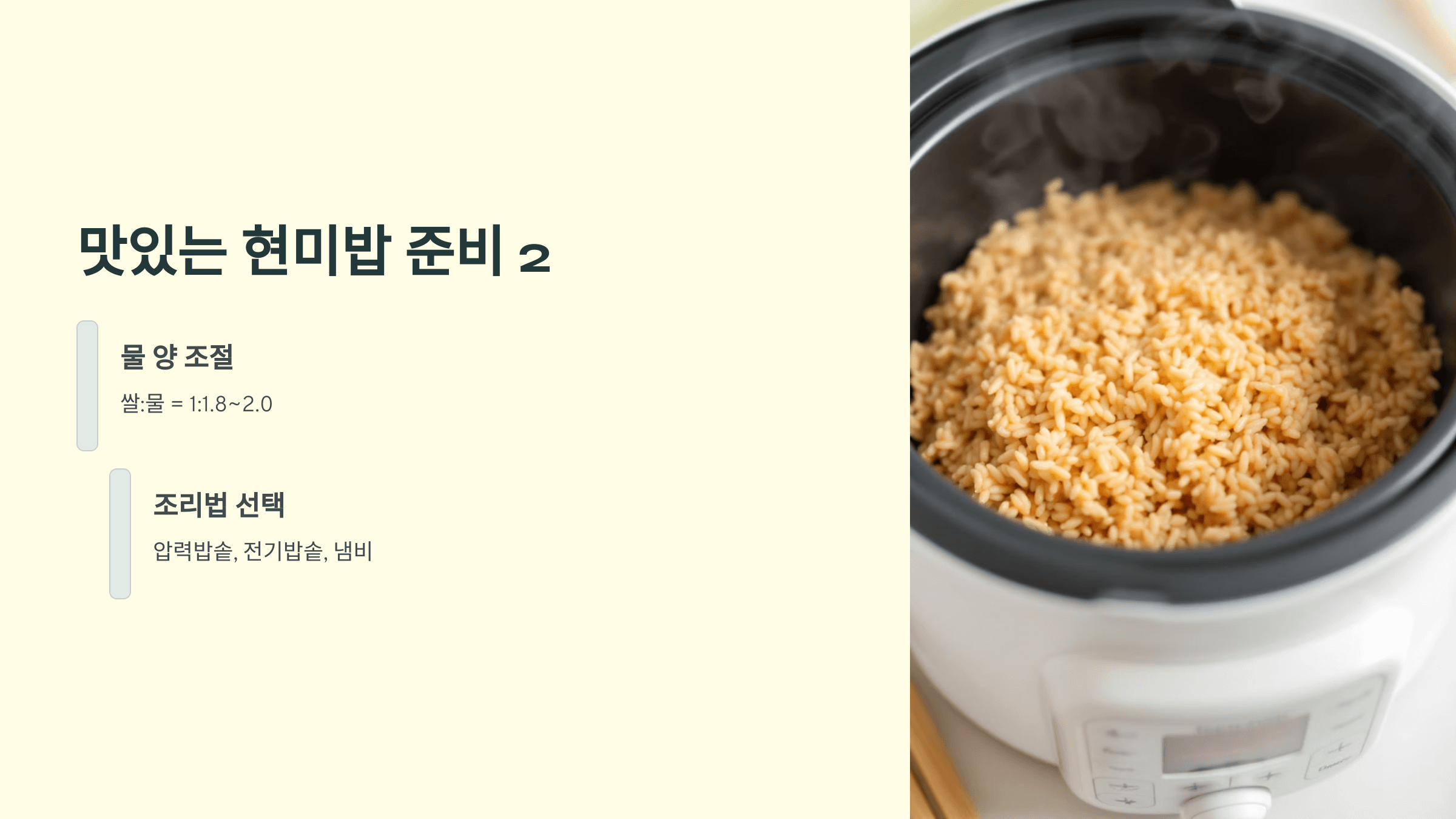 - 쌀:물 비율은 1:1.8~2.0 정도 (조리 기구에 따라 조정)