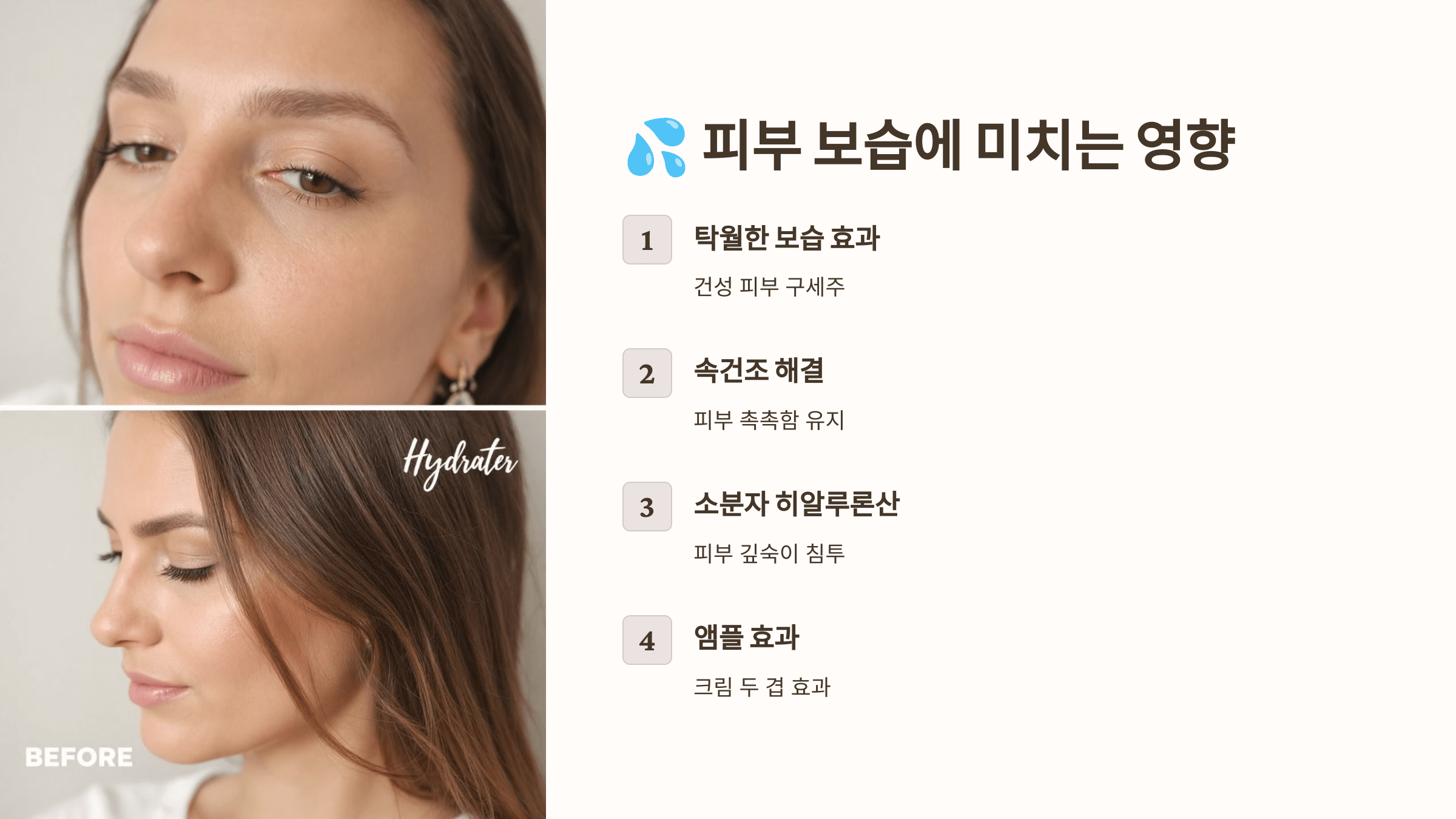 모든 피부 타입에 사용할 수 있지만, 특히 건성 피부나 속건조가 심한 분들에게 효과가 탁월해요.