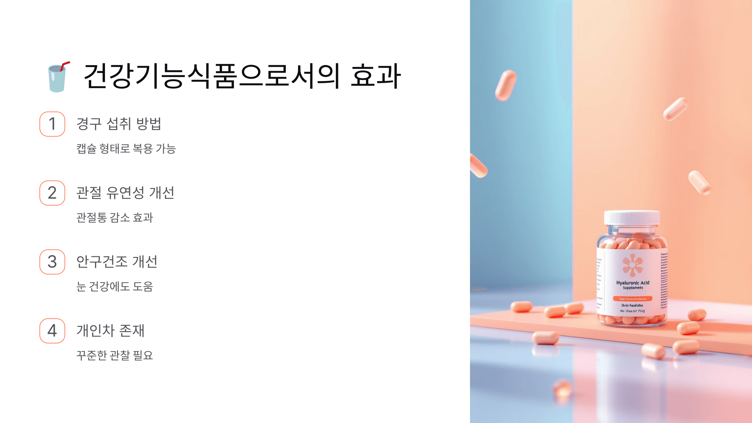 저도 한동안 히알루론산 캡슐을 꾸준히 먹어봤는데, 피부뿐만 아니라 관절 유연성이 좋아지는 느낌도 들었어요.