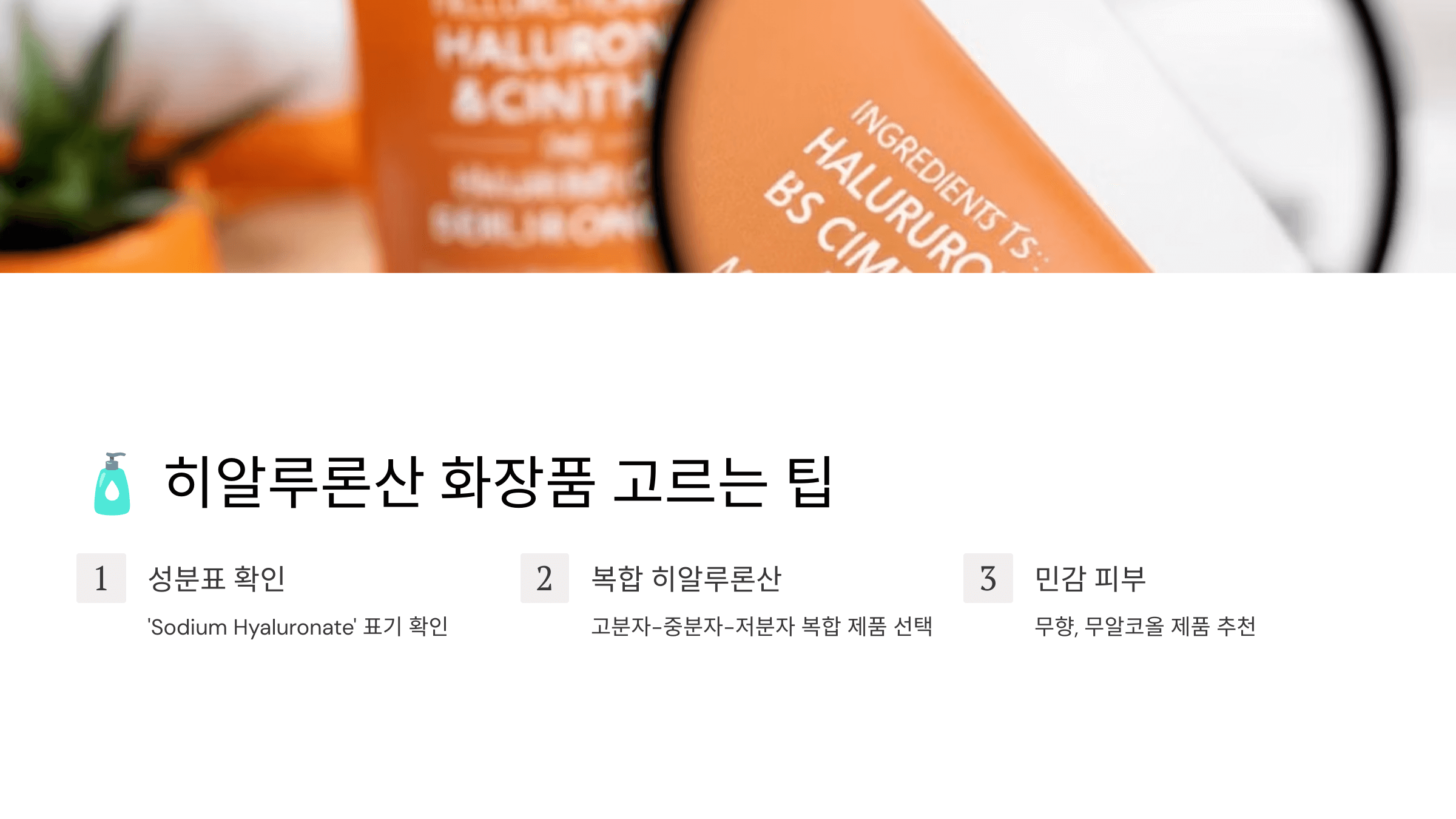 요즘은 거의 모든 수분 제품에 히알루론산이 들어가 있지만, 성분표는 꼭 확인해야 해요.